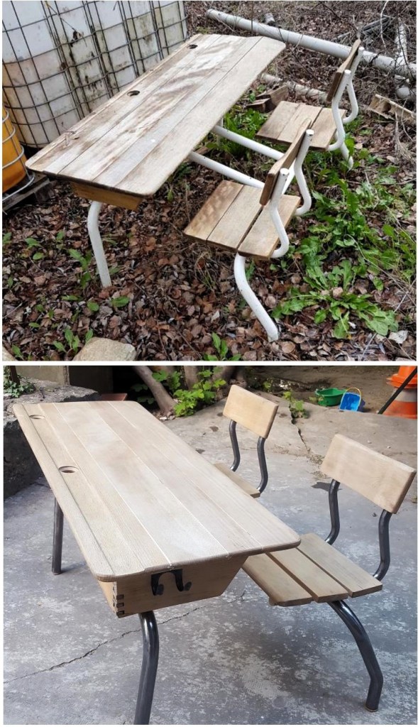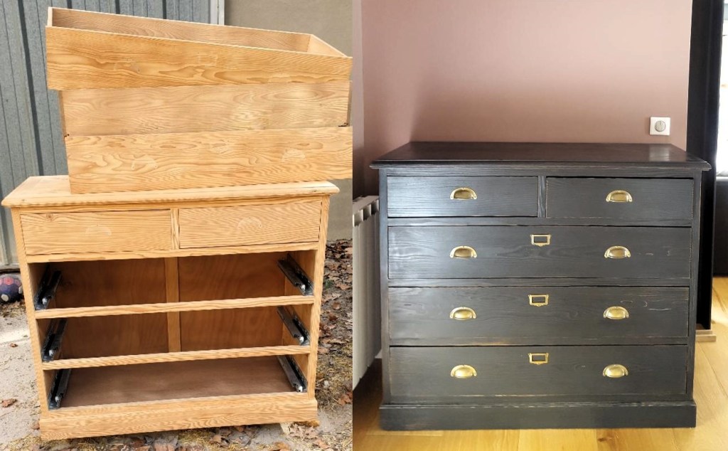 Sablage et Relooking – Commode Ancienne Restauration et Rénovation – Chaises « Tolix »Création Portes Persiennes